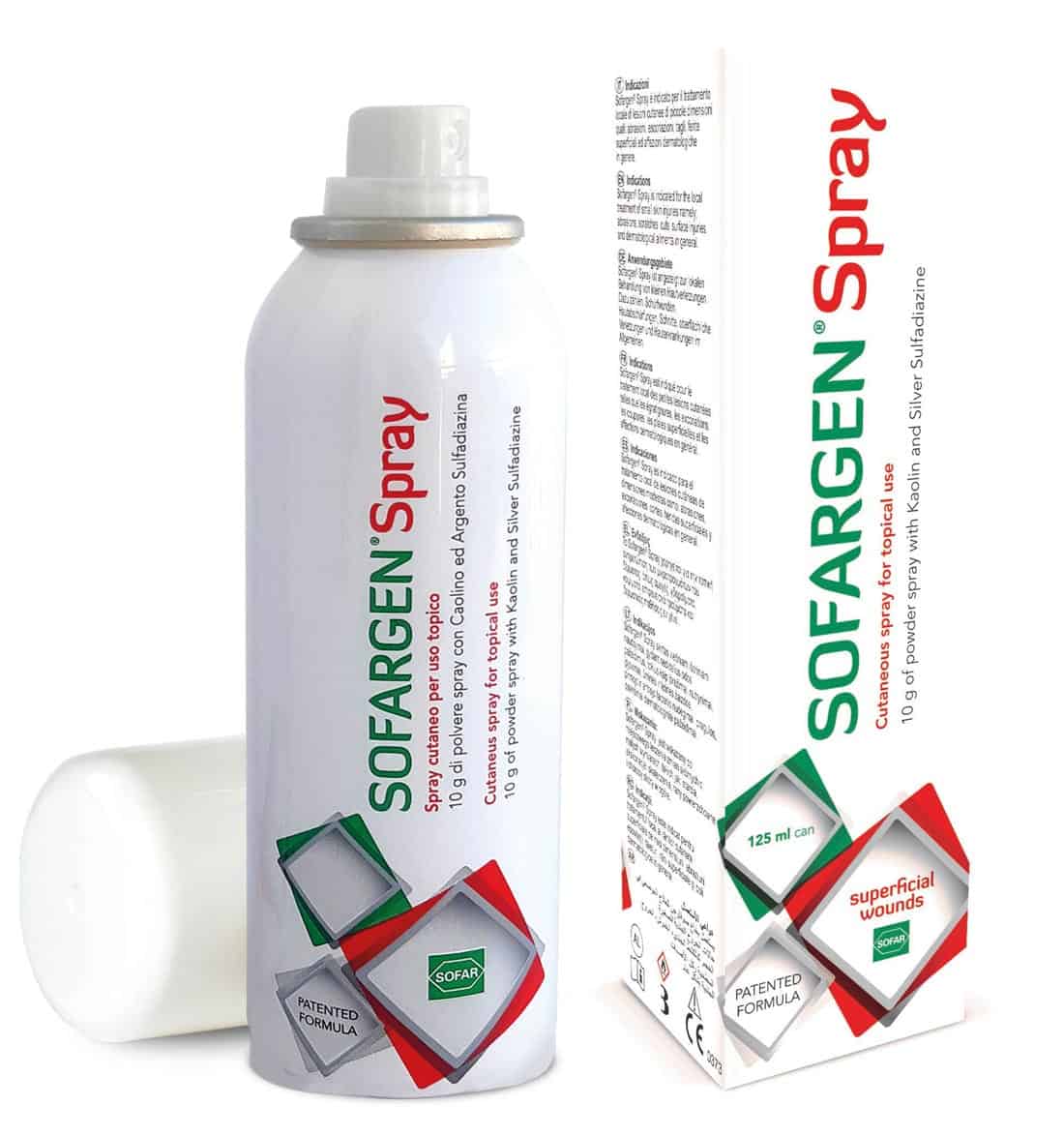 Sofargen® spray is a medical device product in powder form, for the treatment of minor skin wounds, especially cuts, abrasions, cuts, superficial wounds and general skin continuity solutions. It contains two main components, kaolin (light kaolin) and silver sulfadiazine. Kaolin, a fine, white powder, covers the injured skin with a protective crust and at the same time, drains and absorbs the exudates. Sulfadiazine silver thanks to its broad antimicrobial activity (Gram +, Gram-, anaerobic) prevents wound infection.